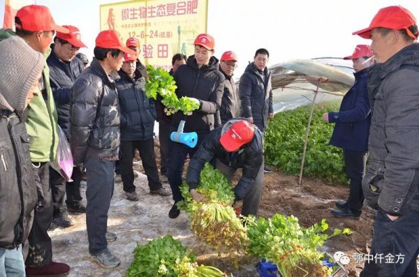 早7:30,測產(chǎn)觀摩現(xiàn)場已經(jīng)彩旗飄飄,鄂中智慧農(nóng)化音響服務(wù)車視頻音響傳播在新野縣蔬菜基地,上午八點(diǎn)現(xiàn)場就已經(jīng)聚集了100多人,示范戶梁東獻(xiàn)掀開大棚,迫不及待的把大家邀請到仟金方西芹示范田里,激情滿懷的講解鄂中仟金方顯著減肥增產(chǎn)效果。他邊說:我種植西芹4年了,8畝蔬菜基地從沒見過這么有實(shí)效的肥料。邊向大家講解示范田和對照田施肥技術(shù):我在苗期定值前每畝施用鄂中仟金方42%(12-6-24)80斤做基肥;對照田每畝施用其它廠家復(fù)合肥54%(18-18-18)100斤做基肥;示范田西芹無死苗,亂根現(xiàn)象,對照田亂根死苗很多,邊角葉也發(fā)黃的快。生長期施用的磷酸銨鈣、復(fù)合肥做追肥都相同,示范田減少了農(nóng)藥及人工投入兩次,到成熟期顯示的效果讓我驚奇。