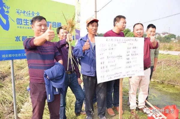 中南大區總經理李九稽總結分析介紹:鄂中仟金方是把無機養分、有機質、微生物菌群及復合內驅因子有機結合于一體的綜合集成科技成果,體現無機化學肥料、有機肥料以及微生物肥料的綜合效果,是當前農作物的首選肥料。鄂中仟金方肥料能夠利用空氣中的氮,通過有益菌生長代謝產生相應的酶和酸,可對土壤中難溶性的磷、鉀肥(土壤中難溶性磷肥占95%,難溶性鉀占98%)進行分解,從而成為水稻所能吸收的磷鉀營養。因此能夠大大提高水稻對肥料的利用率,從而減少肥料的施用量。在受災嚴重的情況下,還能保證水稻穩產不減產,甚至取得了節本增產增效的良好效果。