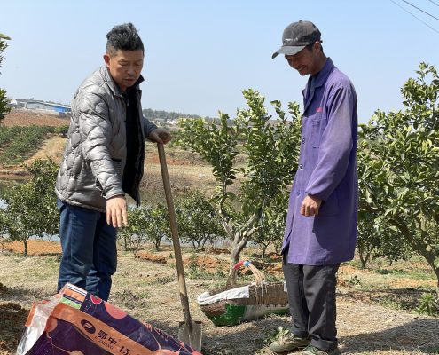 圖為何世勇(左)正在給柑農示范施肥技術…