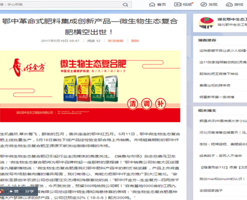 《中國新型肥料網(wǎng)》.《肥料信息網(wǎng)》等新媒體強(qiáng)烈關(guān)注鄂中仟金方微生物生態(tài)復(fù)合肥:鄂中生態(tài)革命式肥料集成創(chuàng)新產(chǎn)品—微生物生態(tài)復(fù)合肥橫空出世!